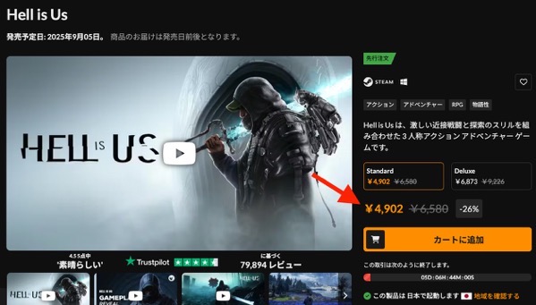 PC版「Hell is Us」の通常版は、Steamの日本向け価格だと6,580円ですが、外部ストアのFanaticalだと4,902円でSteamキーが購入可能です。(※外部ストア=ゲームのプロダクトコードが買えるサイト。サイトによっては実際にはクレジットカードの為替レートや、購入するタイミング等で誤差がでます)