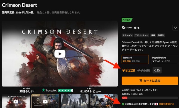 発売日が2026年3月20日のPC版「紅の砂漠(Crimson Desert)」は、SteamやEpic Gamesストアで購入するより、外部ストアのFanatical等で買う方がお値段的に得。ゲーム自体は日本語UI・字幕に対応。