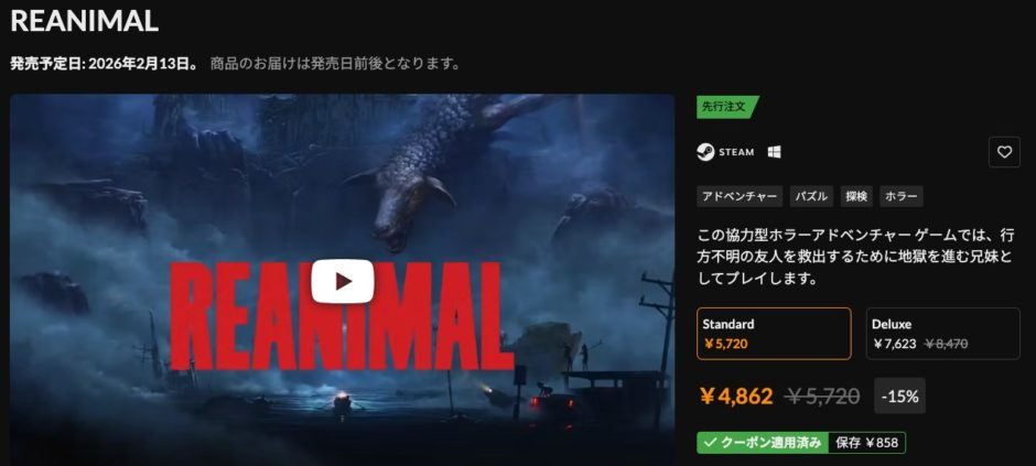 発売日が2026年2月13日のPC版「REANIMAL(リアニマル)」は、Steamで購入するより、外部ストアのFanatical等で買う方がお値段的に得。ゲーム自体は日本語UI・吹き替え・字幕に対応。